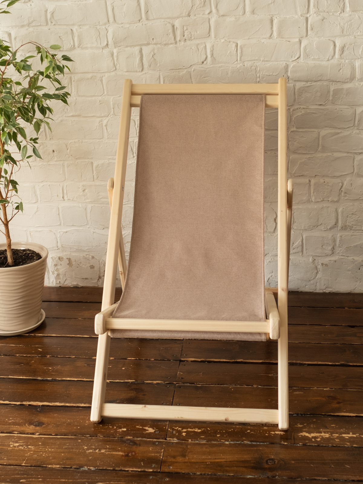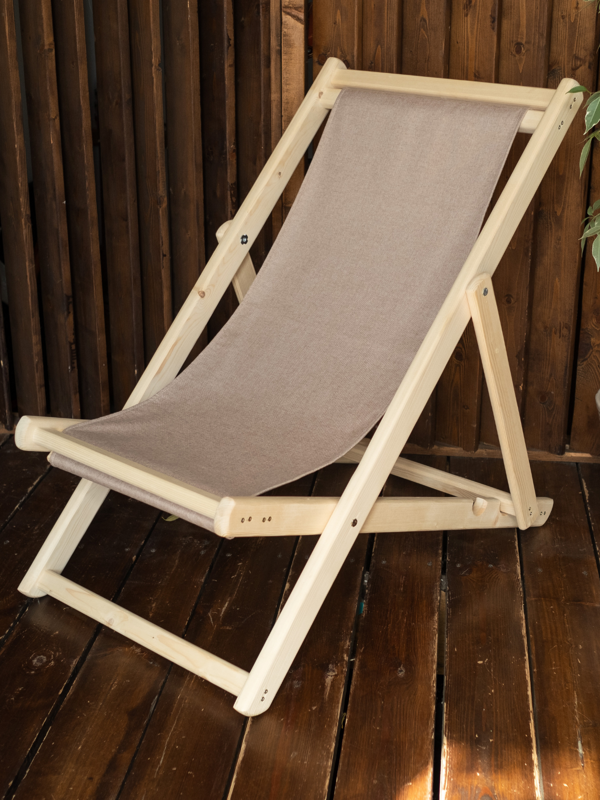 Шезлонг с бежевой тканью, деревянный, складной