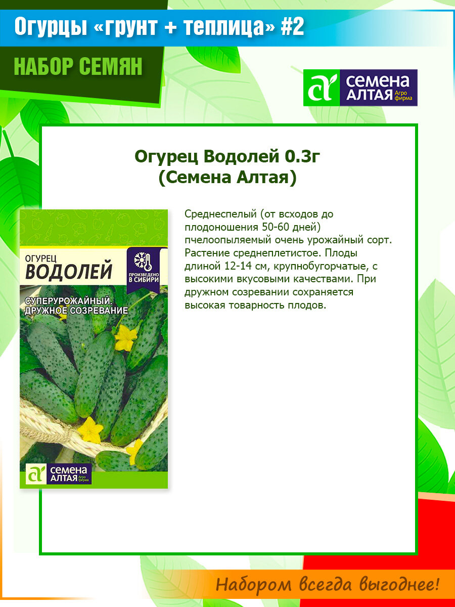 Набор семян огурцов: Алтай, Парижский корнишон, Дальневосточный, Зозуля f1, Водолей, Чижик f1 от Семена Алтая (6 пачек) интересное: