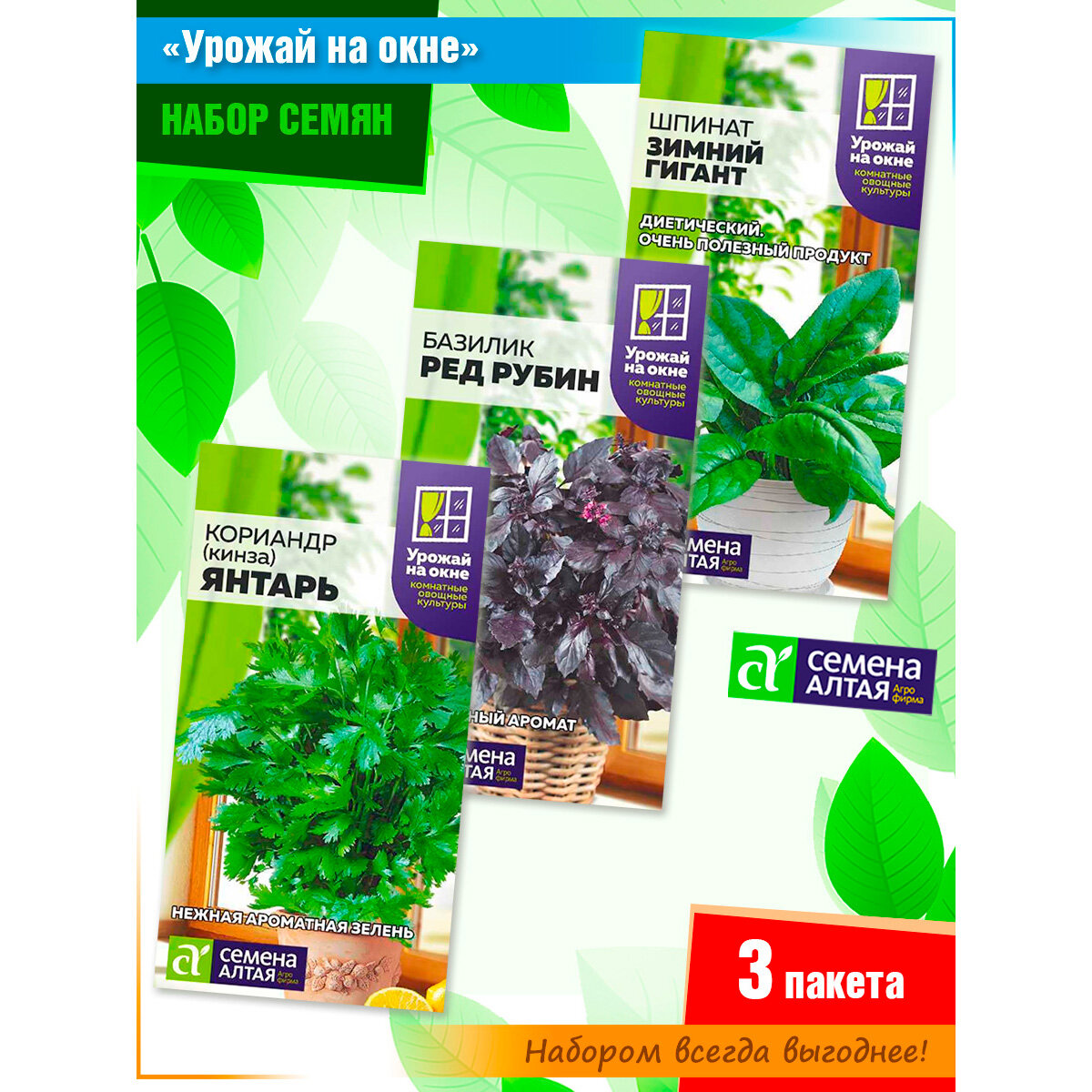 Набор семян "Урожай на окне": кориандр (кинза) Янтарь, базилик Ред Рубин, шпинат Зимний гигант от Семена Алтая (3 пачки) интересное: