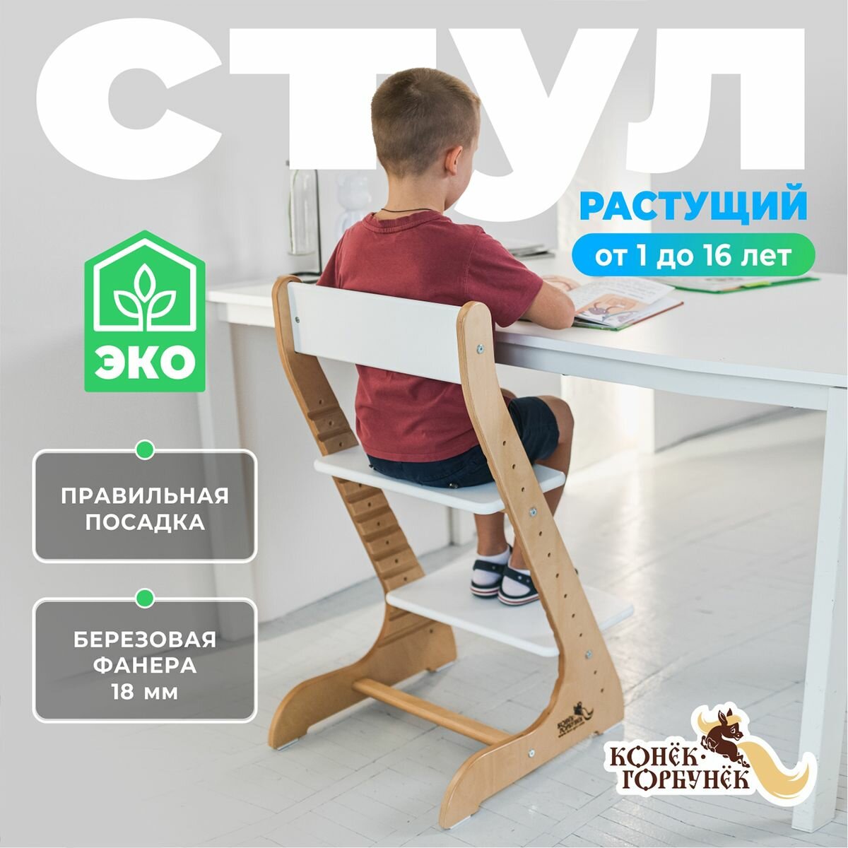 Растущий стул для детей, детский деревянный стульчик для школьника Конек Горбунек Стандарт, цвет Белый