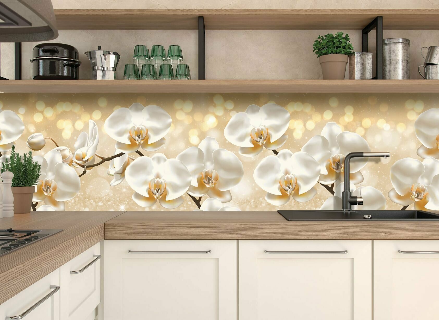 Фартук для кухни на стену 3000х600 мм, глянцевый Молочная орхидея. Панель стеновая ПВХ влагостойкая декоративная