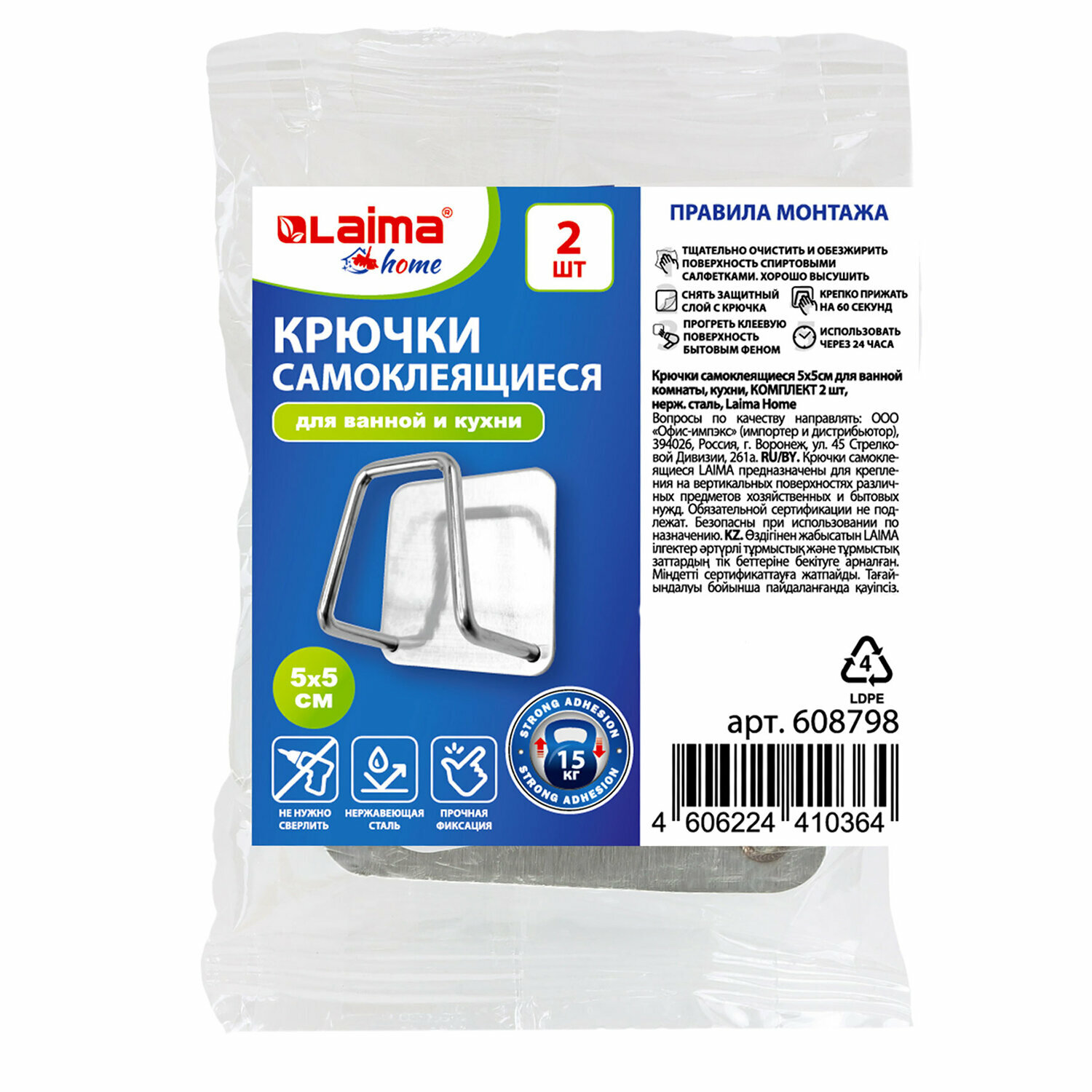 Крючки самоклеящиеся 5х5 см для ванной комнаты, кухни, комплект 2 шт, нержавеющая сталь, LAIMA Home, 608798 интересное:
