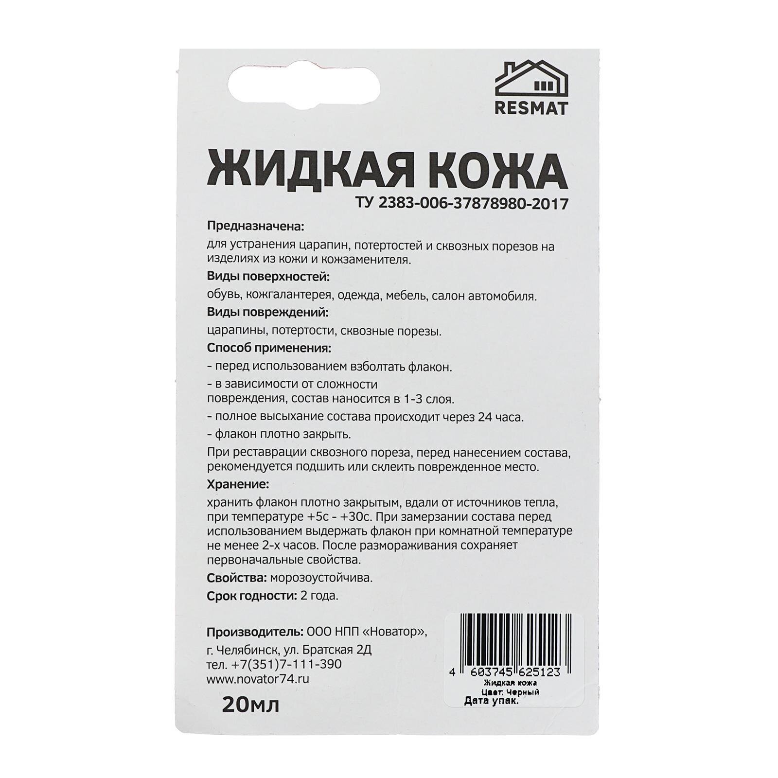 Жидкая кожа "Resmat", черная, для ремонта и реставрации потертостей/царапин/сквозных порезов, 20 мл интересное: