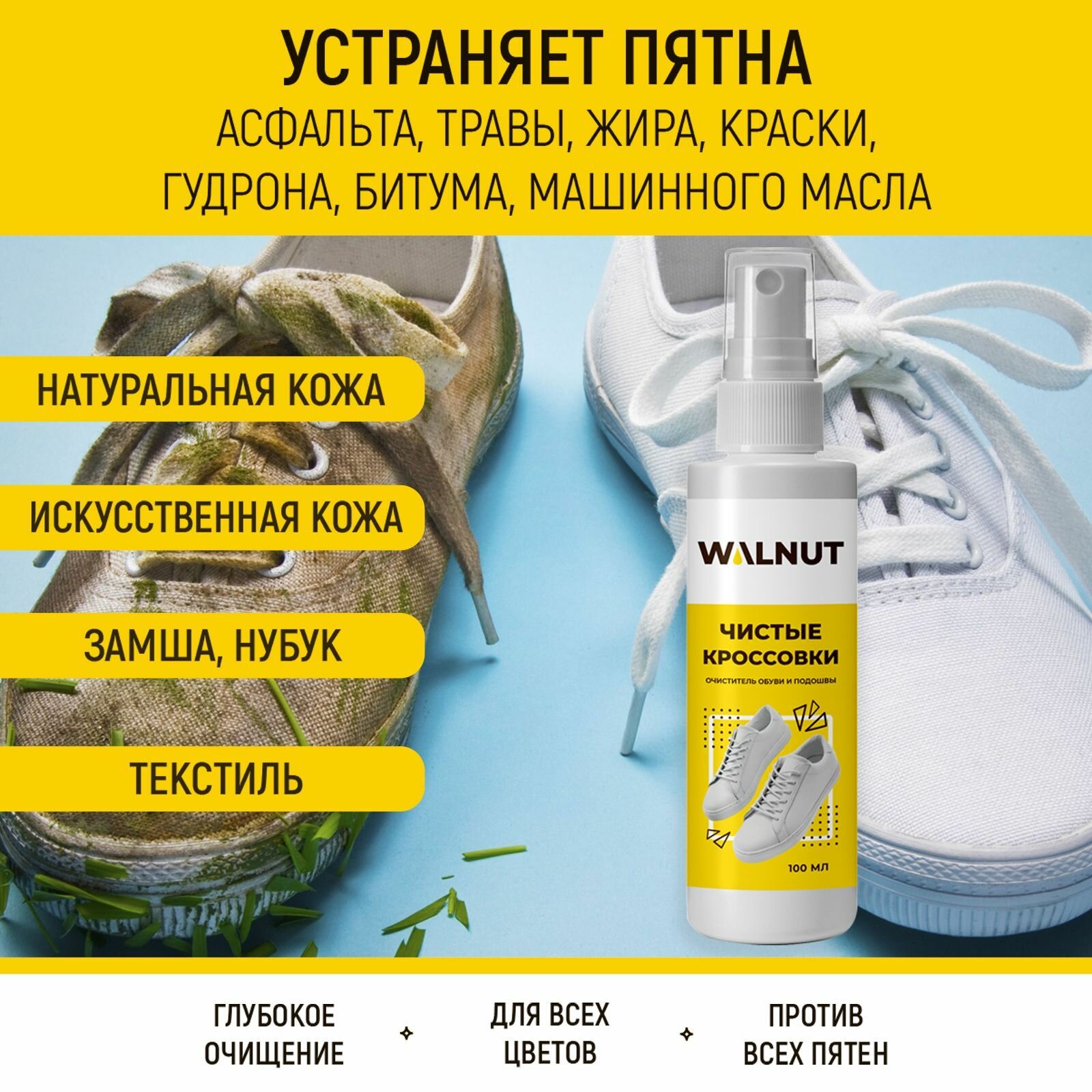 Очиститель обуви WALNUT "Чистые кроссовки", антибактериальный, 100 мл, белый