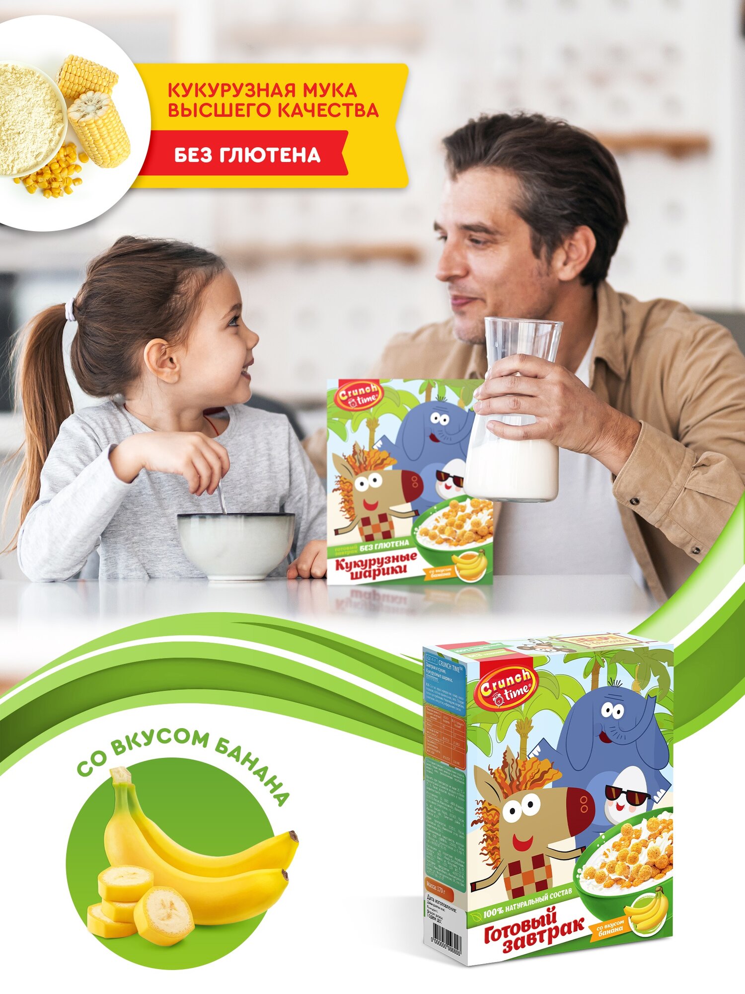Сухой завтрак Crunch Time "Зебра в Клеточку", кукурузные шарики, со вкусом банана, 170 гр. интересное: