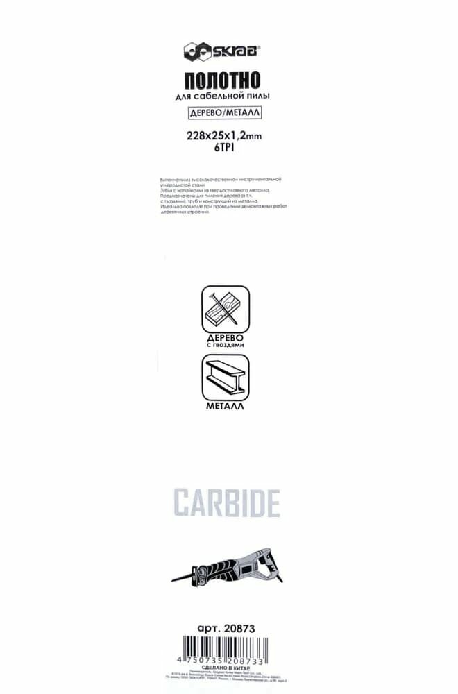 Полотно для сабельной пилы дерево металл 228х25х1,2мм CARBIDE TCT 6TPI Skrab 20873