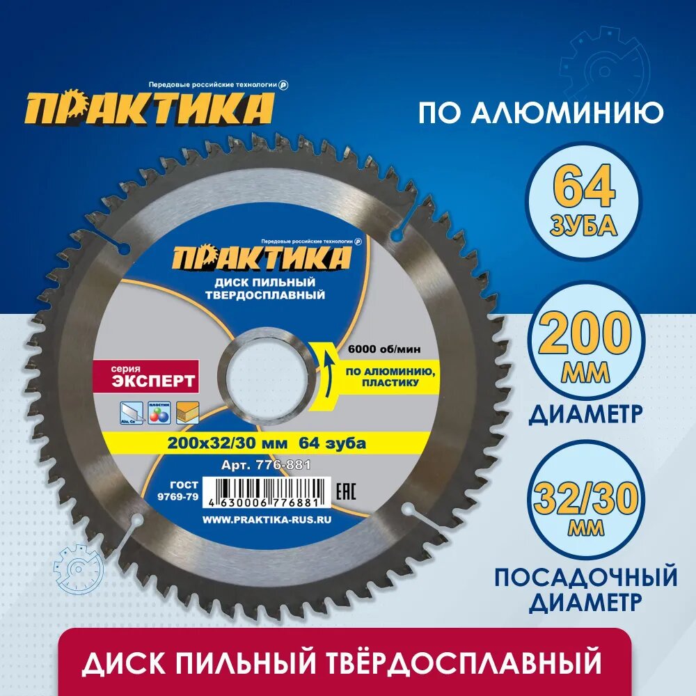 Диск пильный твёрдосплавный по алюминию ПРАКТИКА 200 х 32/30мм, 64 зуба