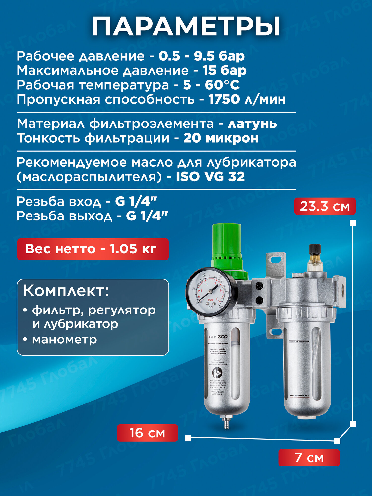 Фильтр воздушный с регулятором давления и маслораспылителем 1/4" ECO (AU-02-14) интересное: