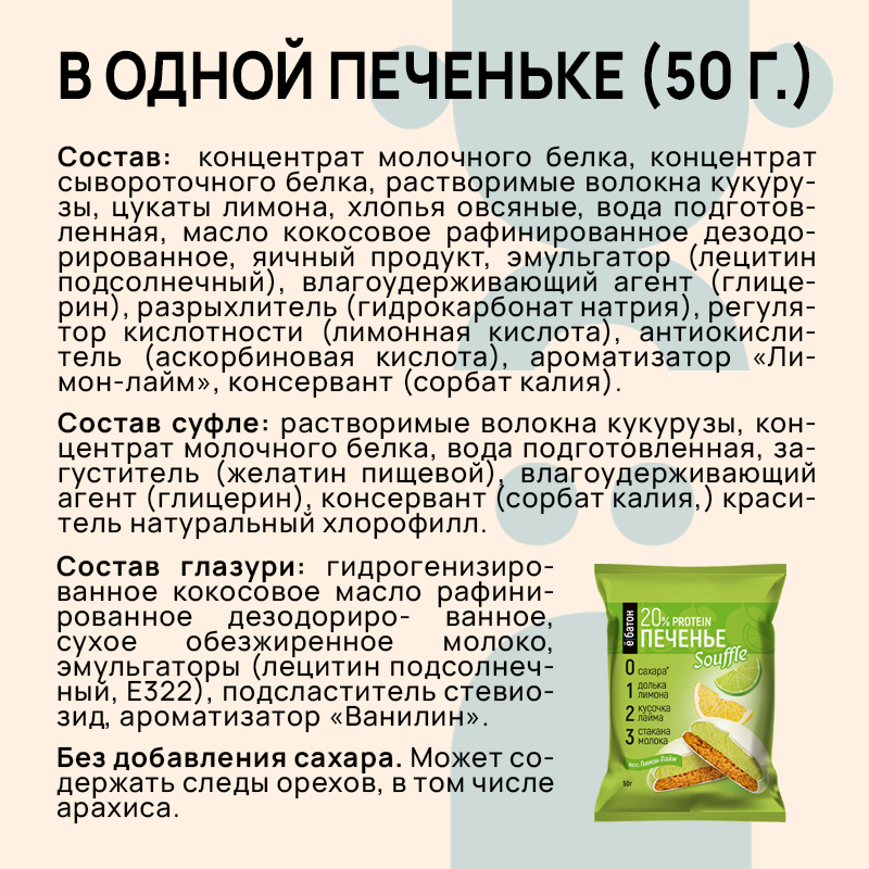Протеиновое печенье ё|батон с белковым суфле, без сахара и муки , 4 шт по 50 г Лимон-Лайм