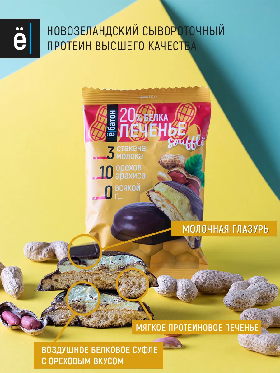 Протеиновое печенье "ё|батон" с белковым суфле 20% белка, с арахисом, 50гр., 4шт