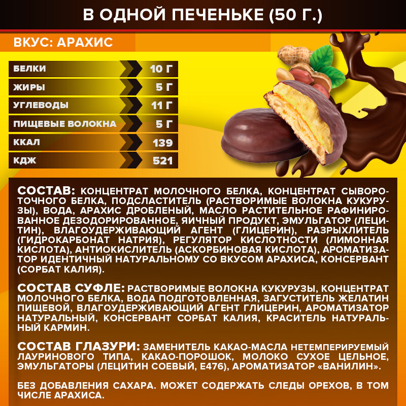СохранитьПротеиновое печенье ё|батон с белковым суфле и с арахисом, без сахара 9 шт по 50 г интересное: