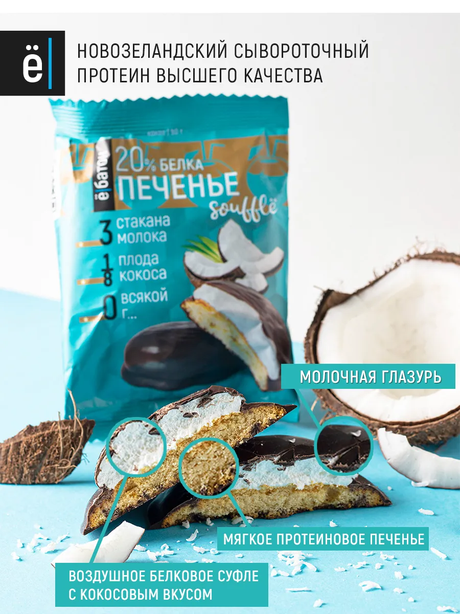 Купить Протеиновое печенье ё|батон с белковым суфле, без сахара, без муки, 4 шт по 50 г Кокос