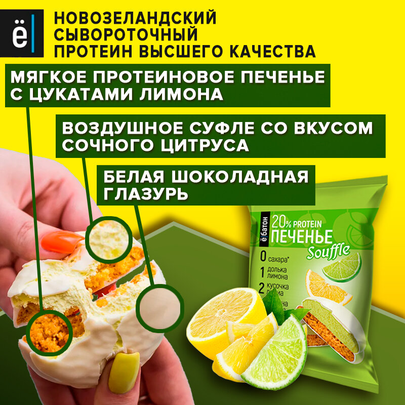 Купить Протеиновое печенье ё|батон с белковым суфле, без сахара и муки , 4 шт по 50 г Лимон-Лайм