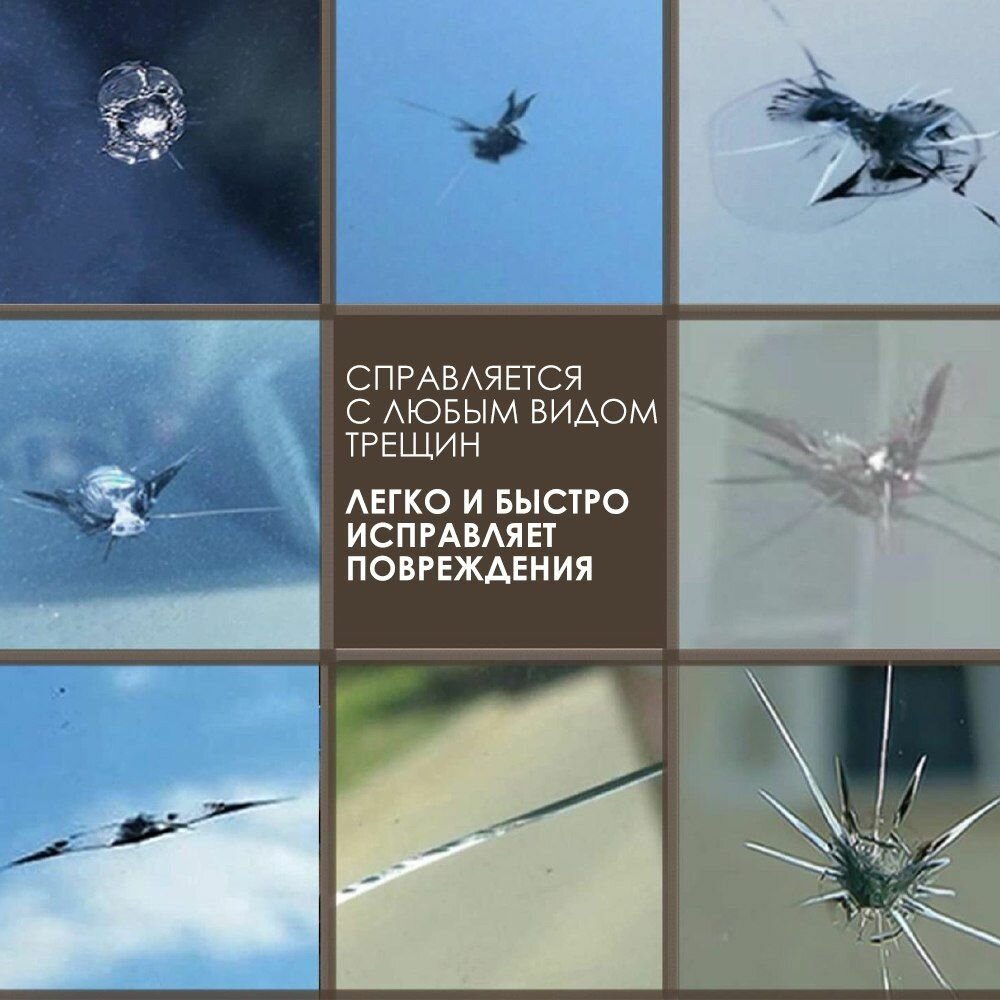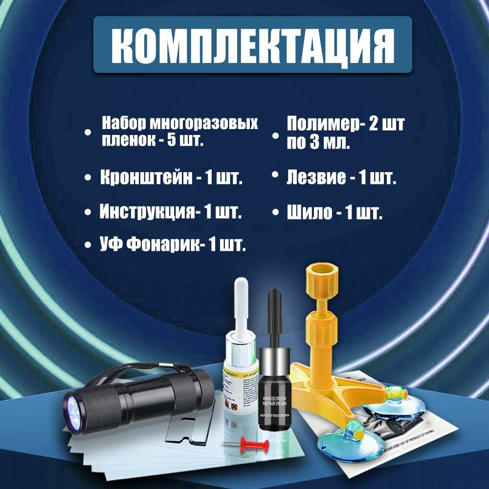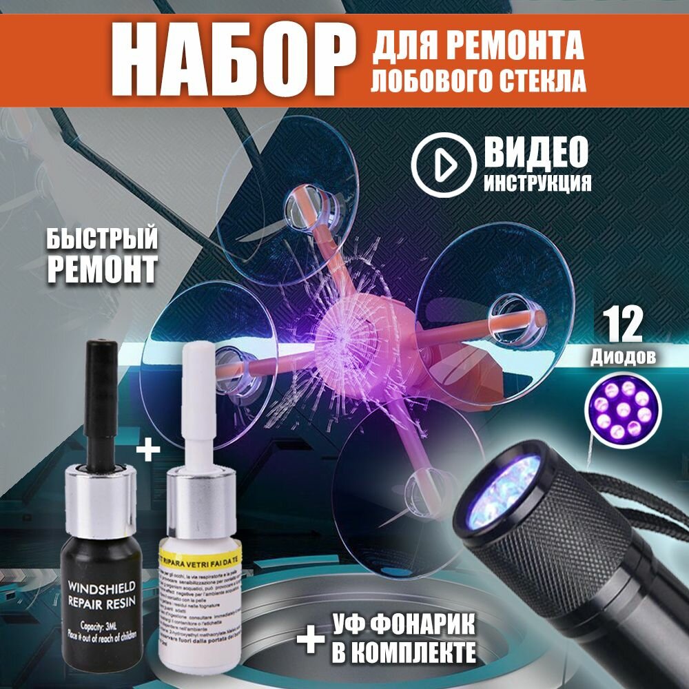 Ремкомплект + Ультрафиолетовый фонарик. Клей Полимер для ремонта сколов и трещин лобового стекла автомобиля. интересное: