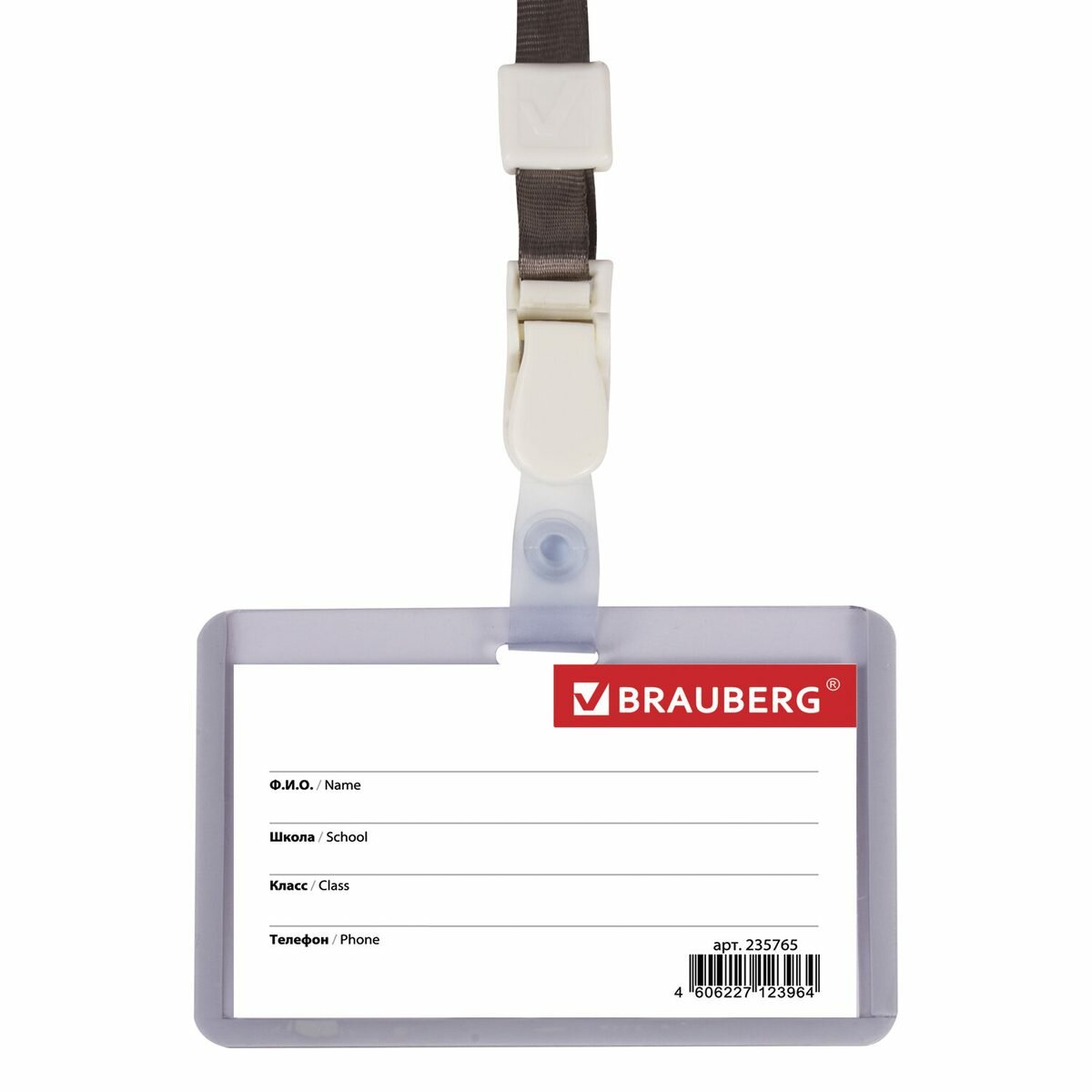 Купить Бейдж школьника горизонтальный Brauberg, 55х90мм, мягкий пластик, на ленте со съемным зажимом, серый (235765), 10шт.
