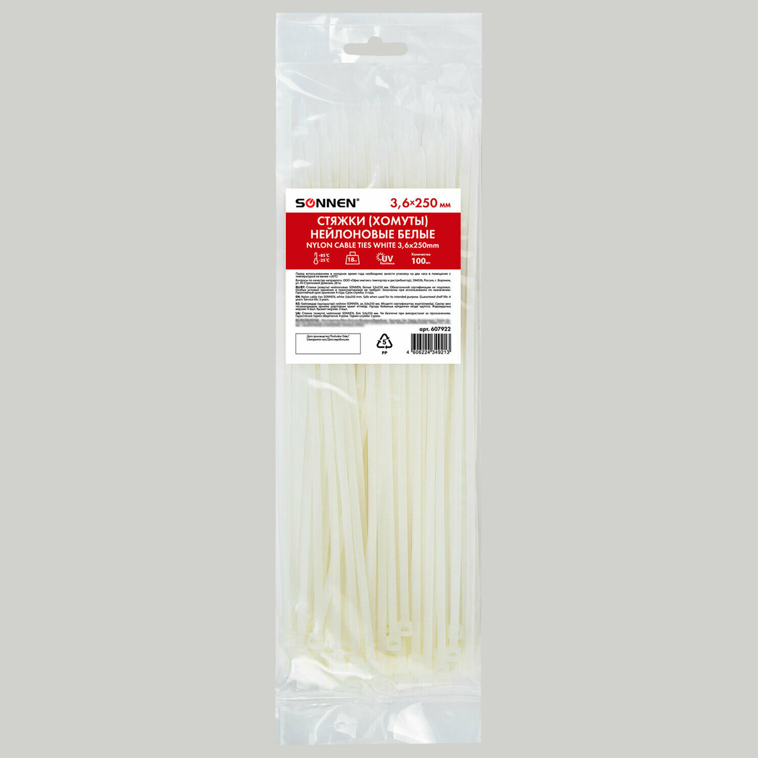 Стяжка Sonnen (хомут) нейлоновая сверхпрочная Power Lock, 3,6x250 мм, комплект 100 шт., белая, 607922