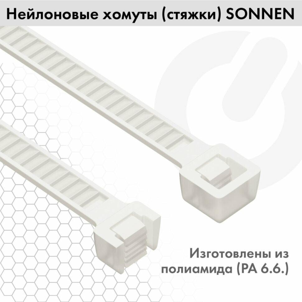 Стяжка Sonnen (хомут) нейлоновая сверхпрочная Power Lock, 3,6x250 мм, комплект 100 шт., белая, 607922