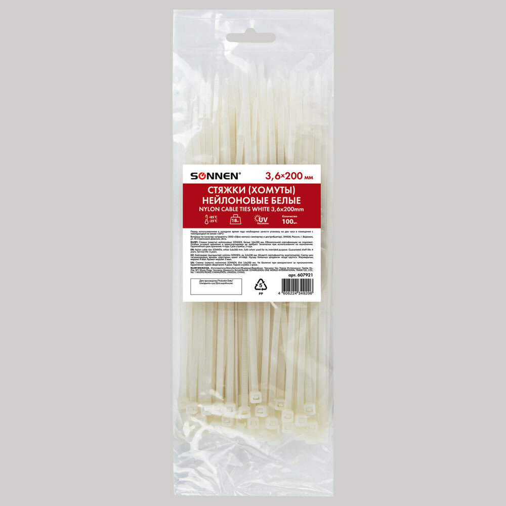 Стяжки Sonnen нейлоновые сверхпрочные, белые, 150 шт