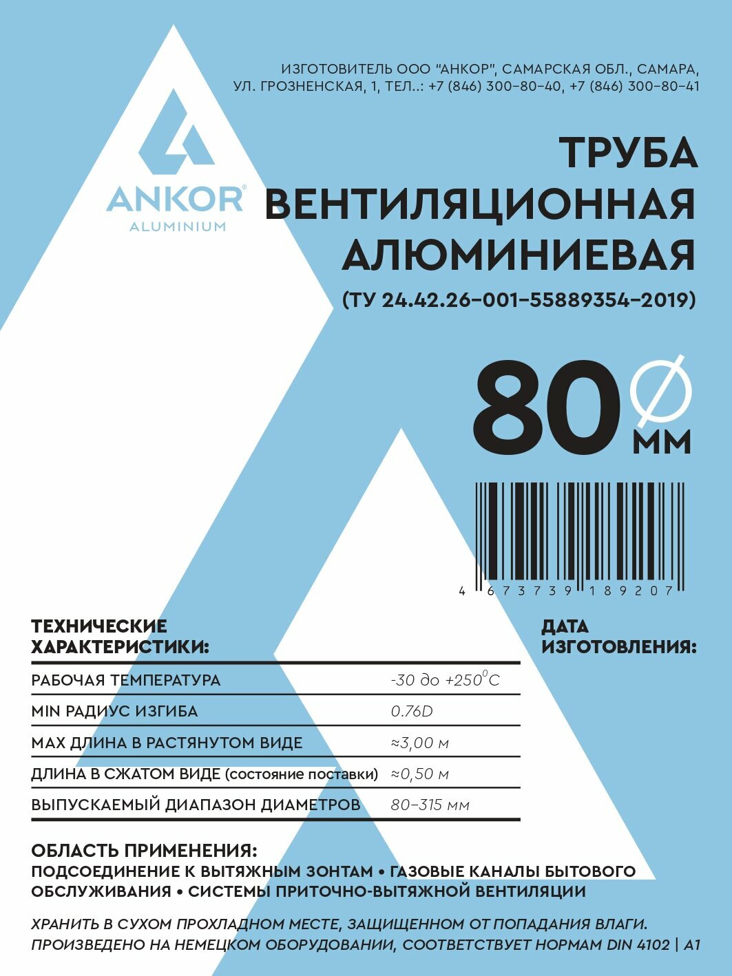 Воздуховод гофрированный алюминиевый "Анкор",диаметр 80мм,длина 3м
