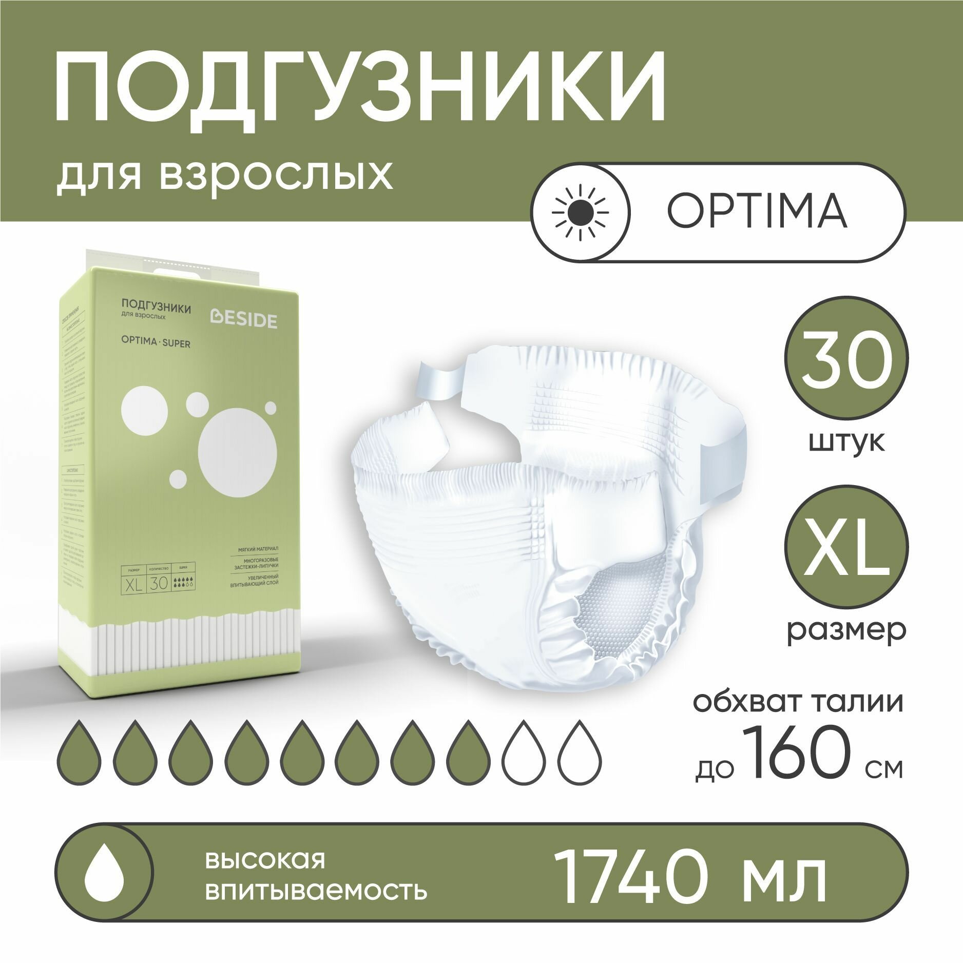 Купить Подгузники для взрослых BESIDE Optima Super, размер XL, БОЛЬШАЯ упаковка 30 шт, обхват талии до 160 см, особопрочные памперсы одноразовые впитывающие гелевые памперсы, без рисунка