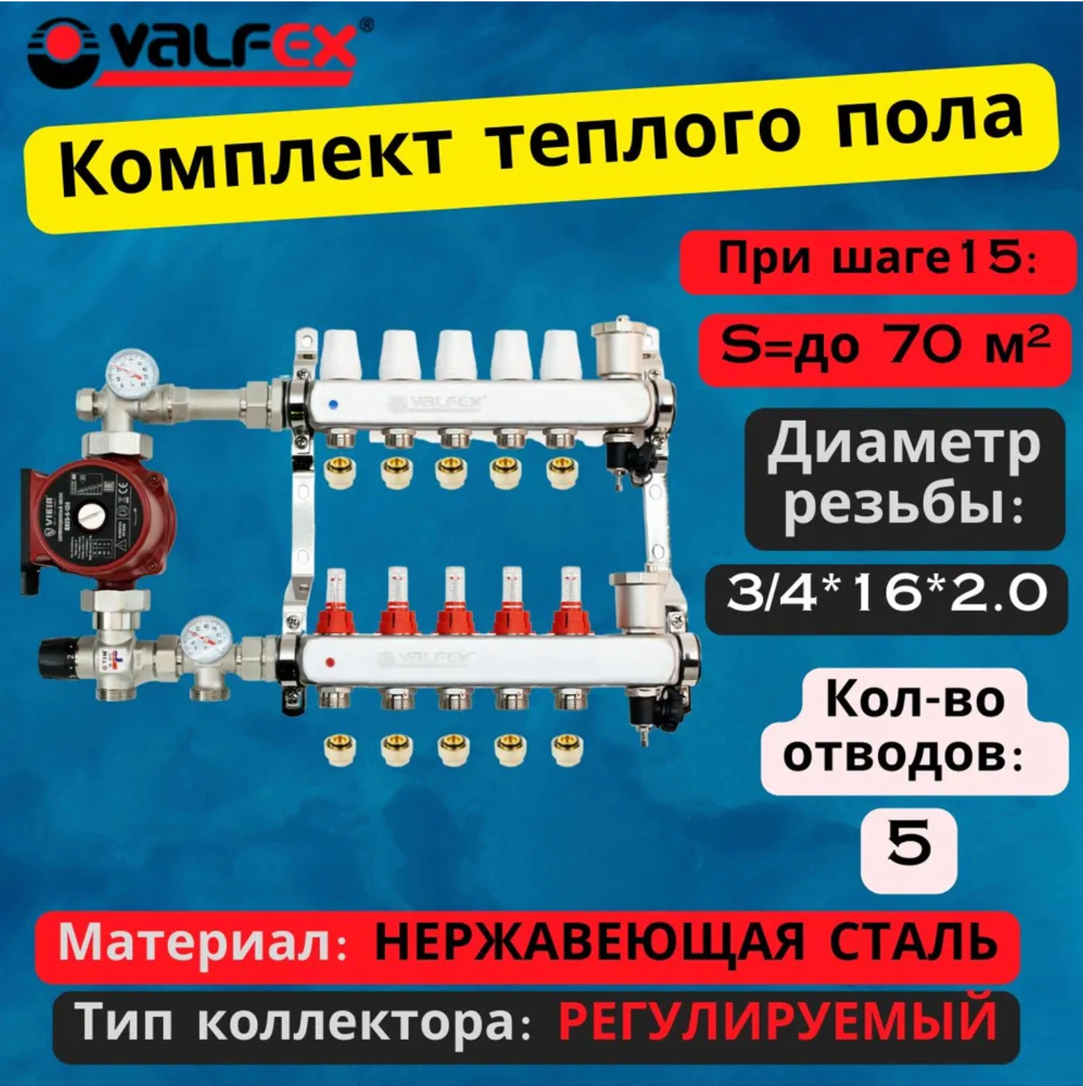 Комплект для водяного теплого пола с насосом до 80 кв/м Коллектор 5 контуров, евроконус 3/4'х16(2.0) VALFEX интересное: