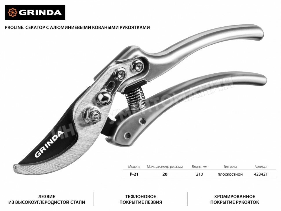 Секатор плоскостной GRINDA P-21, 210 мм, углеродистая сталь, хромированное покрытие, с алюминиевыми коваными рукоятками, PROLine 423421