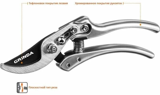 GRINDA P-21, 210 мм, углеродистая сталь, хромированное покрытие, с алюминиевыми коваными рукоятками, плоскостной секатор, PROLine (423421)
