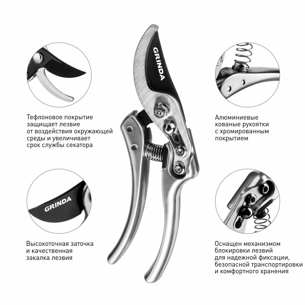 GRINDA P-21, 210 мм, углеродистая сталь, хромированное покрытие, с алюминиевыми коваными рукоятками, плоскостной секатор, PROLine (423421)