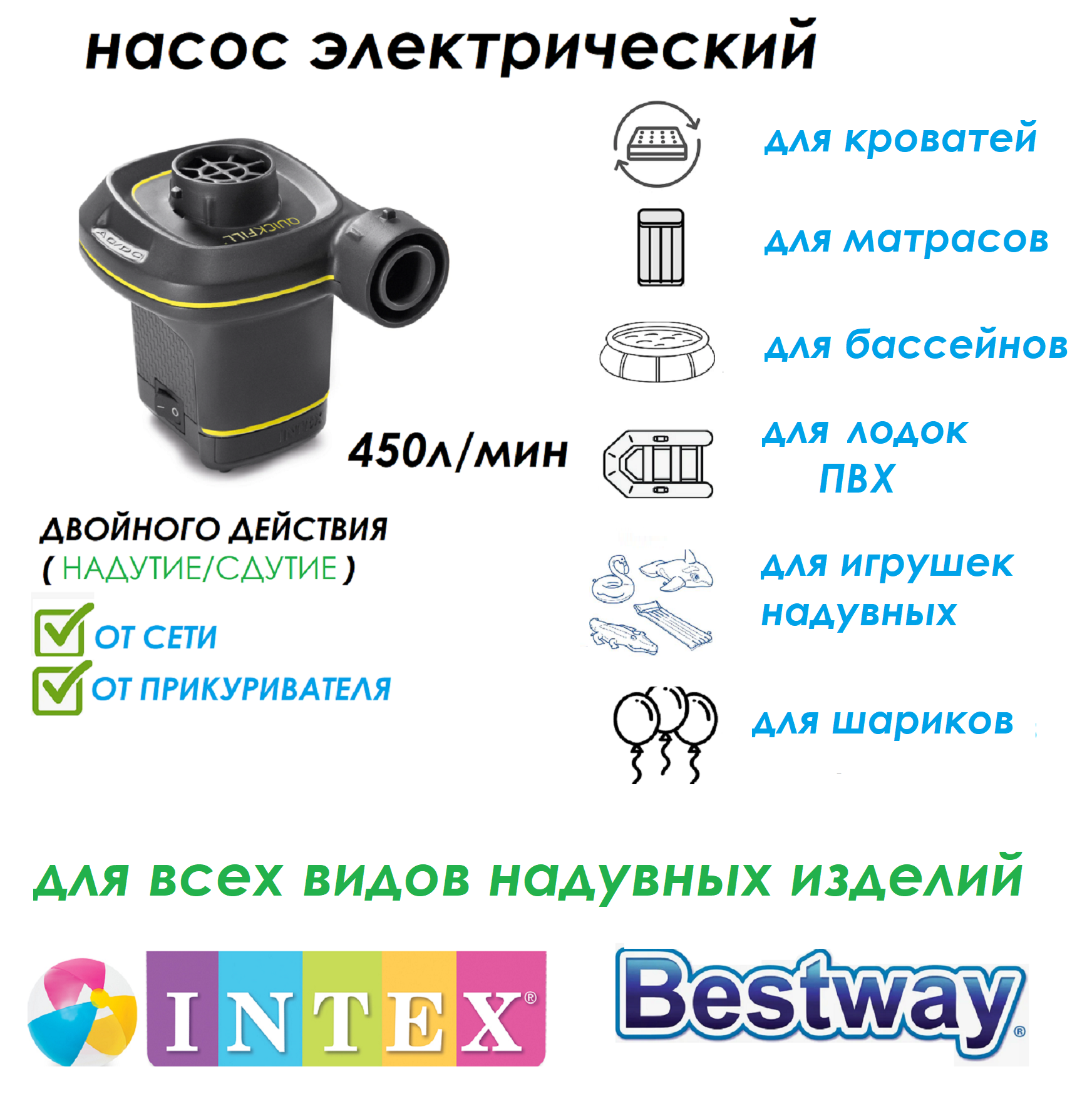 | Дополнительная информация | Насос для надувных матрасов intex электрический 220В/12В |