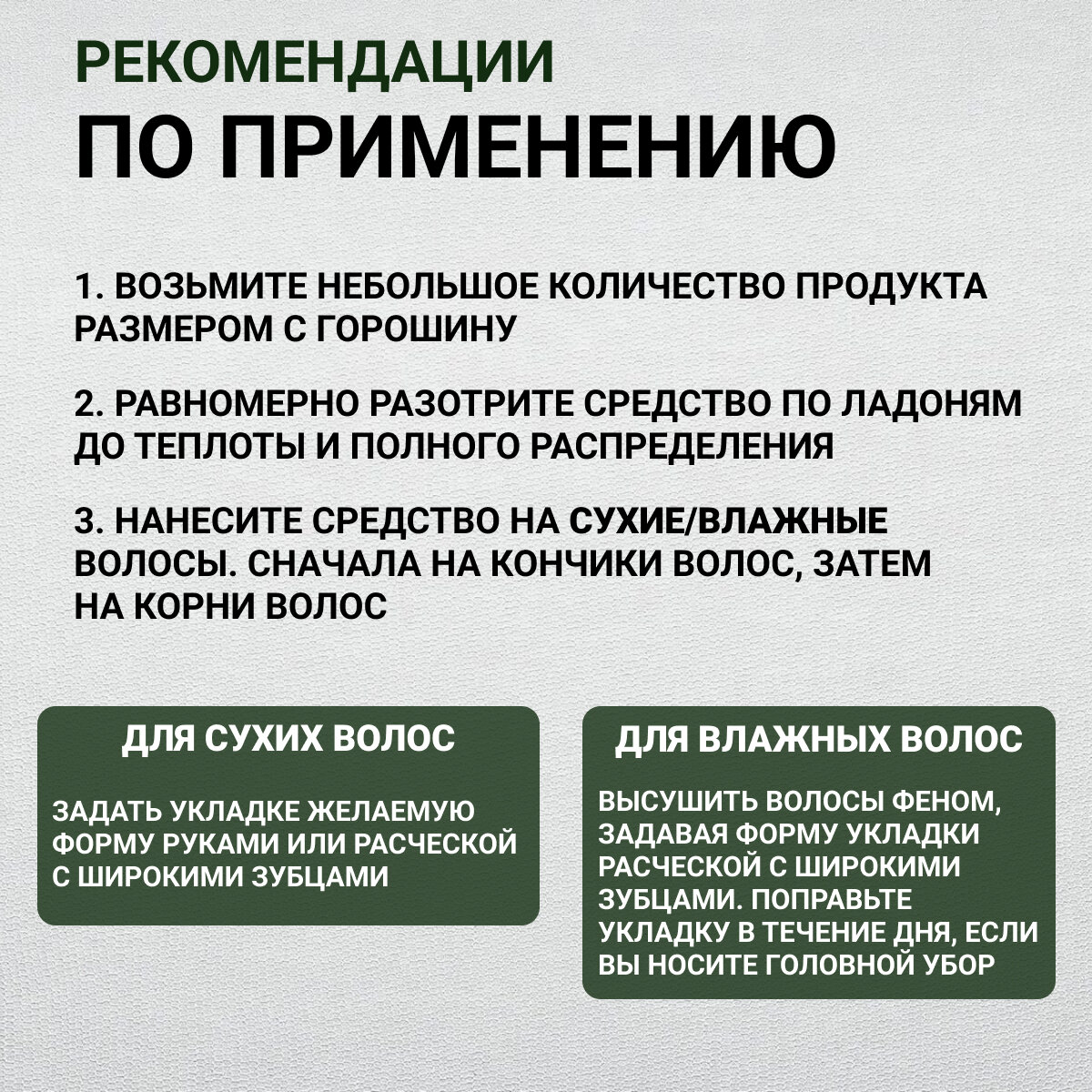 | Способ применения | возьмите небольшое количество продукта размером с горошину, равномерно разотрите средство по ладоням до теплоты и полного распределения, нанесите средство на сухие или влажные волосы от корней до кончиков задайте укладке желаемую форму с помощью расчёски, поправьте укладку в течение дня, если вы носите головной убор |