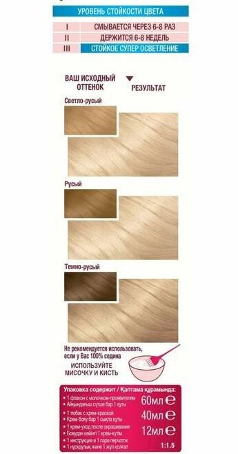 | Комплектация | - флакон с молочком-проявителем (60 мл),- тюбик с обесцвечивающим кремом (40 мл),- крем-уход после окрашивания (10 мл),- инструкция,- пара перчаток |