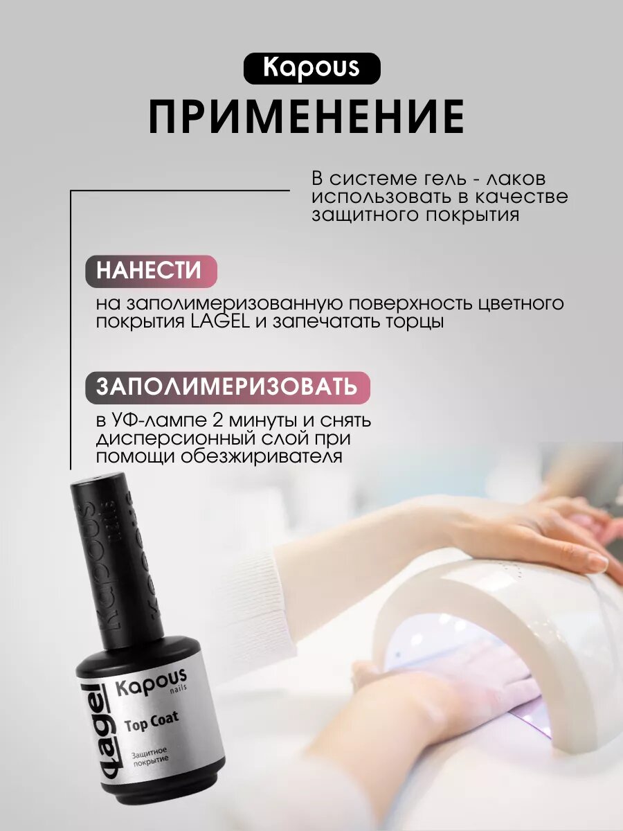 | Способ применения | Нанести на заполимеризованную поверхность цветного покрытия LAGEL. Запечатать торцы. Заполимеризовать в УФ-лампе 2 минуты. Снять дисперсионный слой при помощи обезжиривателя. |