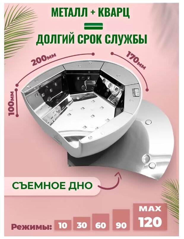 | Особенности | зеркальный отражатель / подходит для педикюра / сенсорное включение / съемное дно |