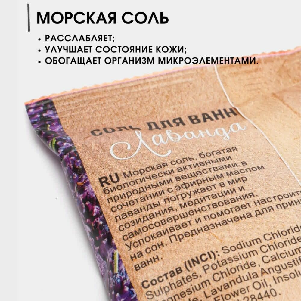 | Способ применения | Основа морской соли - хлорид натрия. Помимо этого в состав входит множество целебных минералов. Благодаря целому комплексу микро- и макроэлементов, входящих в состав морской соли, она благоприятно воздействует не только на кожу, но и на организм в целом. Морская соль с лавандой восстанавливает эмоциональное равновесие, стимулирует обновление клеток, успокаивает раздраженную кожу и способствует нормализации сна. |