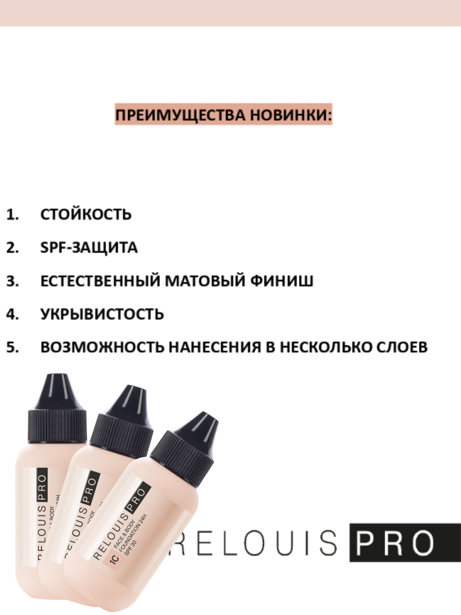 СохранитьТональный крем Face&Body Foundation 24H SPF30 тон 2N средний нейтральный RELOUIS PRO интересное: