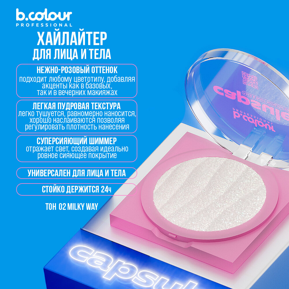 СохранитьB.COLOUR PROFESSIONAL Хайлайтер для лица, хайлайтер для тела сияющий, сухой, с легкой муссовой текстурой, CAPSULE 02 MILKY WAY интересное: