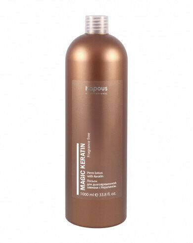 | Способ применения | вымыть волосы шампунем для всех типов волос Kapous, подсушить полотенцем; волосы накрутить на бигуди и тщательно пропитать лосьоном; время экспозиции: натуральные тонкие 5-10 минут, натуральные средние 5-12 минут, натуральные толстые 5-15 минут, окрашенные 5-8 минут; по истечении времени выдержки, не снимая бигуди, тщательно промыть волосы теплой водой и нанести нейтрализатор непосредственно на бигуди; оставить воздействовать на 10 минут; снять бигуди, нанести нейтрализатор повторно, предварительно вспенив; время экспозиции 5 минут; тщательно промыть теплой водой; для завершения процесса нанести на влажные волосы кондиционер-реструктурант с кератином на 5-7 минут, смыть обильным количеством воды, при необходимости использовать кератин бальзам |