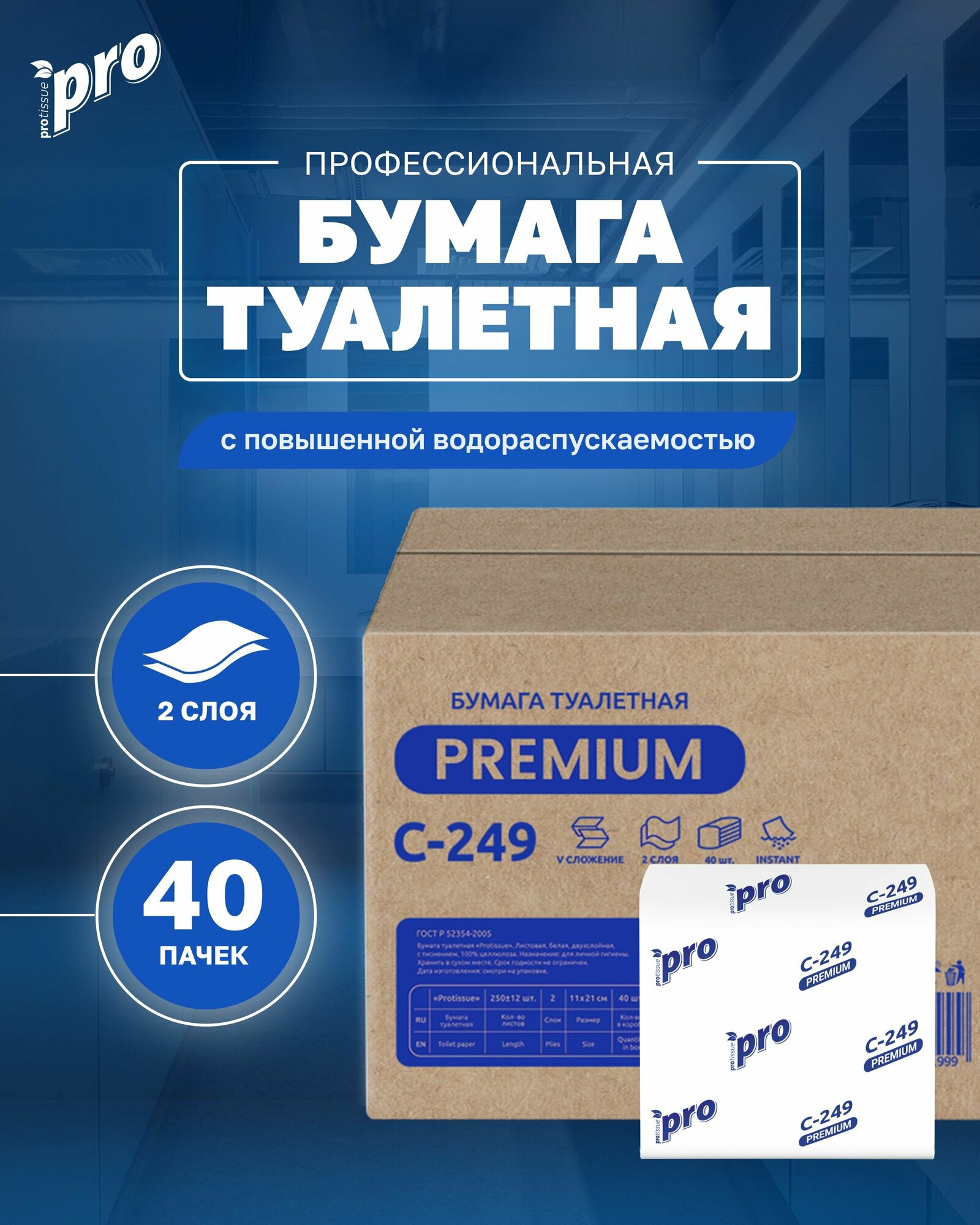 СохранитьТуалетная бумага PROtissue 2-слойная 40 пачек по 250 листов (С249) Premium, с тиснением интересное: