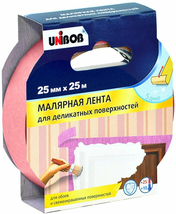 Клейкая лента малярная для деликатных поверхностей 25мм х 25м UNIBOB (розовая)