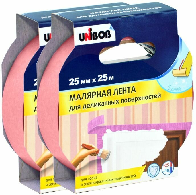 Малярная лента для деликатных поверхностей, розовая, 25 мм х 25 м - 2 шт комплект Unibob интересное: