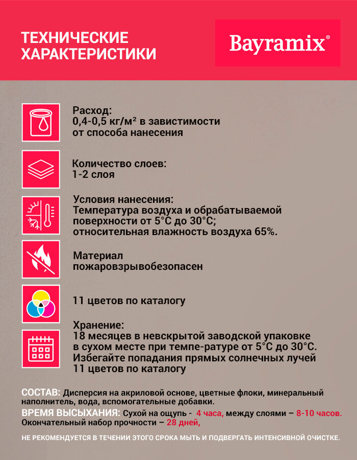| Дополнительная информация | ВРЕМЯ СУШКИ: Время обветривания до заглаживания 7-10 мин. Сухая на ощупь – 12 ч. Полное высыхание – 24 часа (при +20°С и 65% относительной влажности воздуха). |