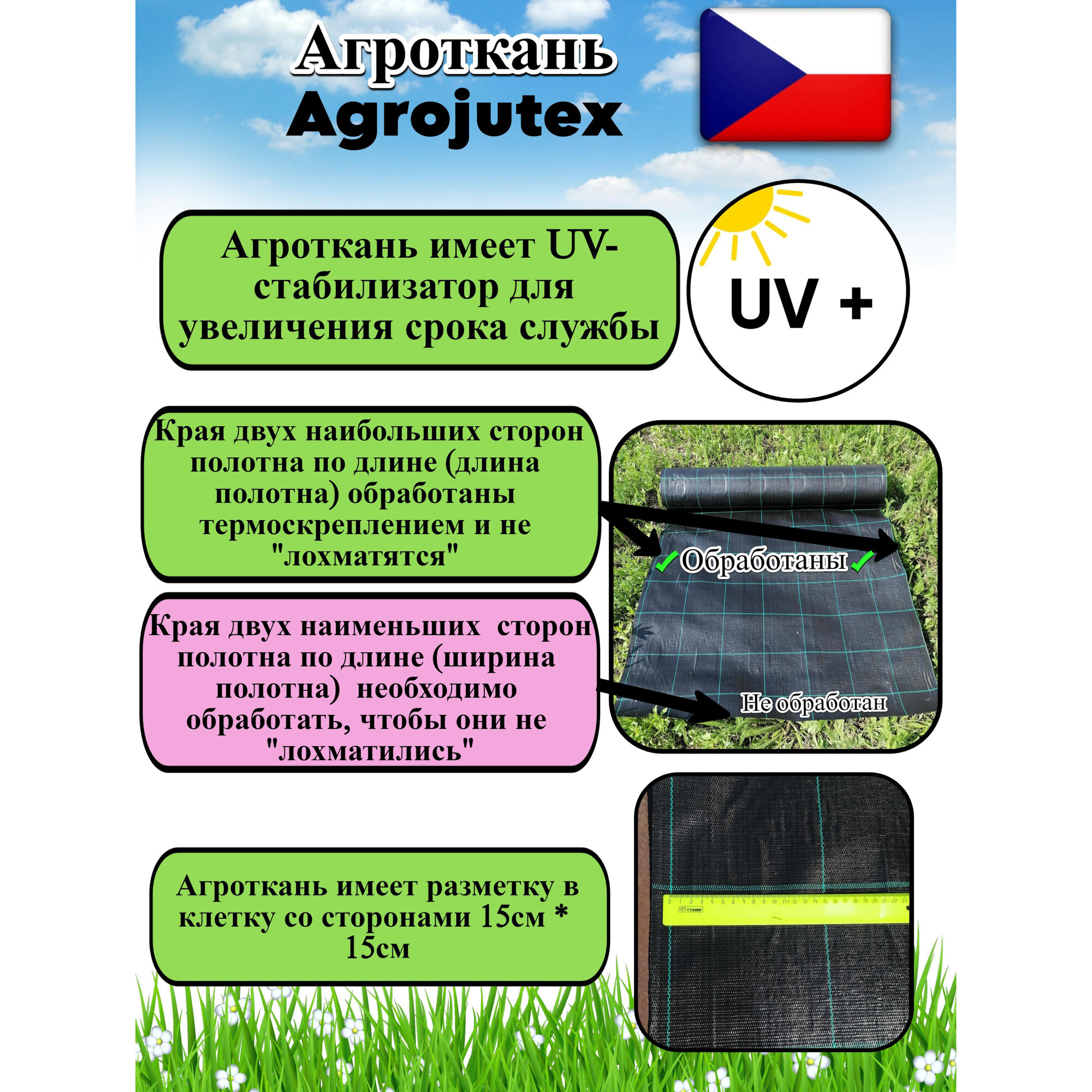 Агроткань застилочная от сорняков Agrojutex, Чехия, 100 г/м2, размеры 1м * 100м, с разметкой