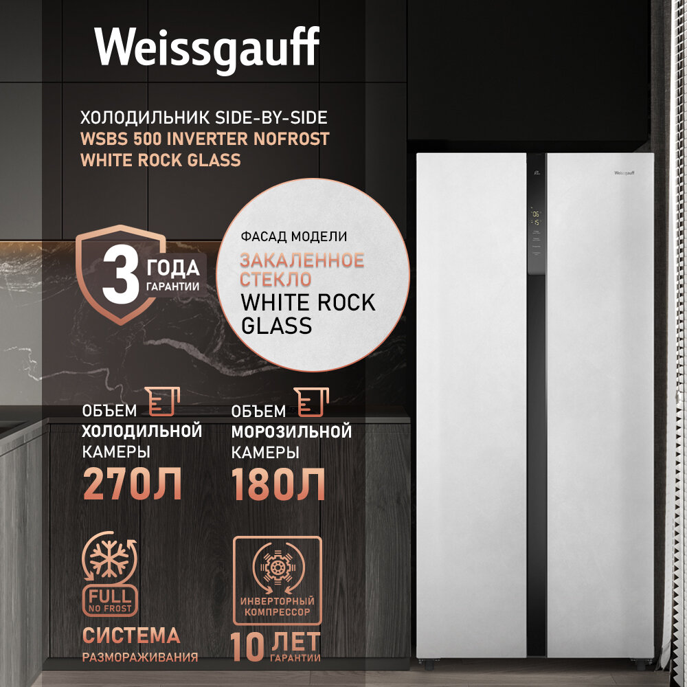 Купить Отдельностоящий холодильник с инвертором Weissgauff WSBS 500 Inverter NoFrost White Rock Glass