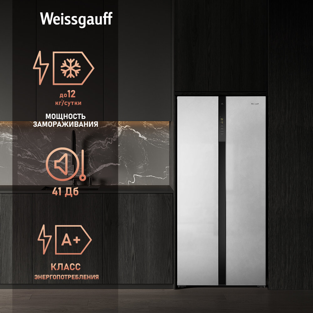 Отдельностоящий холодильник с инвертором Weissgauff WSBS 500 Inverter NoFrost Rock Glass Side by Side двухдверный, 3 года гарантии, Мощность замораживания 12 кг сутки, Сенсорное управление, Цифровой дисплей, Большой общий объём 500 л, Тихий режим работы