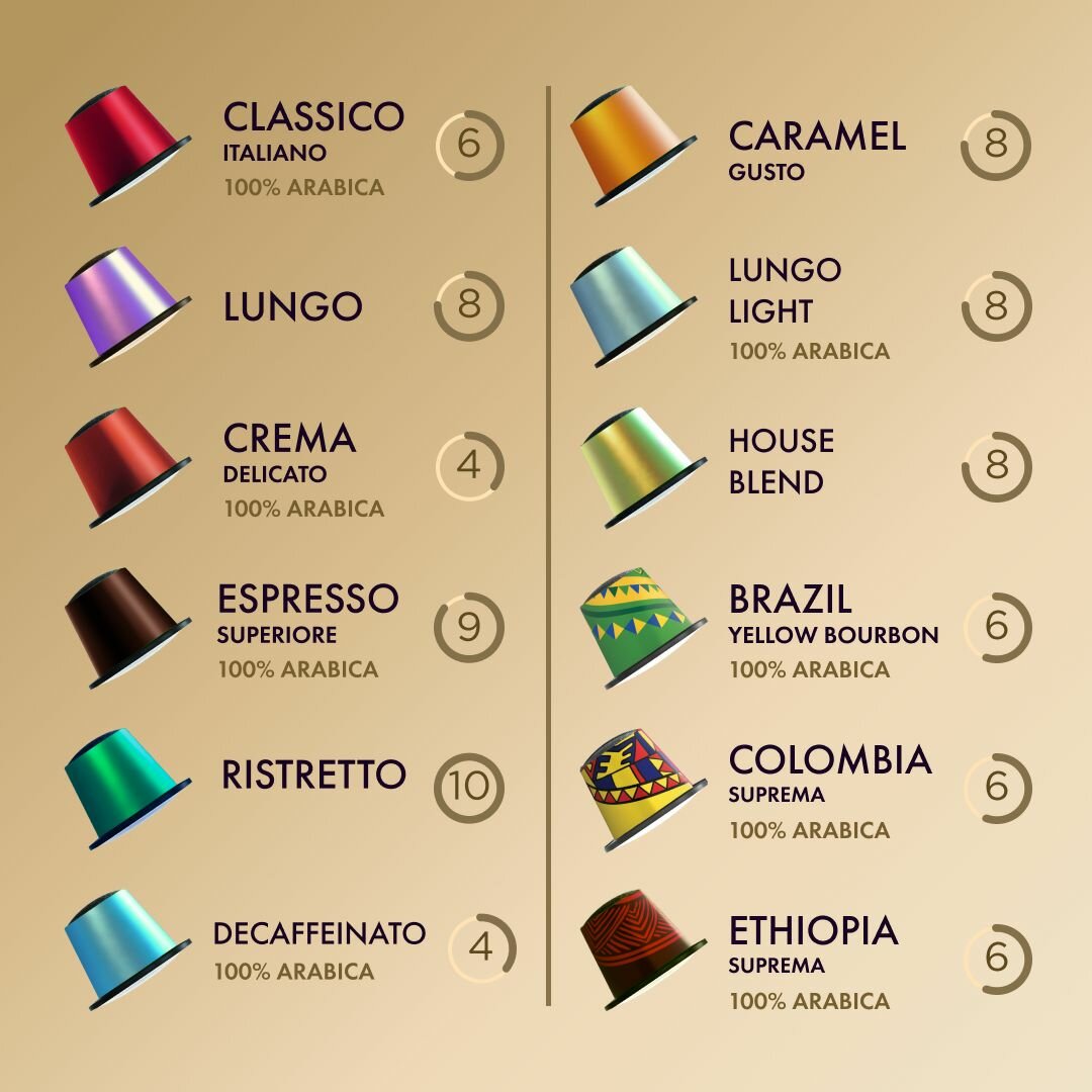 | Состав набора | Classico Italiano 5 шт. Crema Delicato 5 шт. Ristretto 5 шт. Lungo 5 шт. Vanilla 5 шт. Caramel 5 шт. |