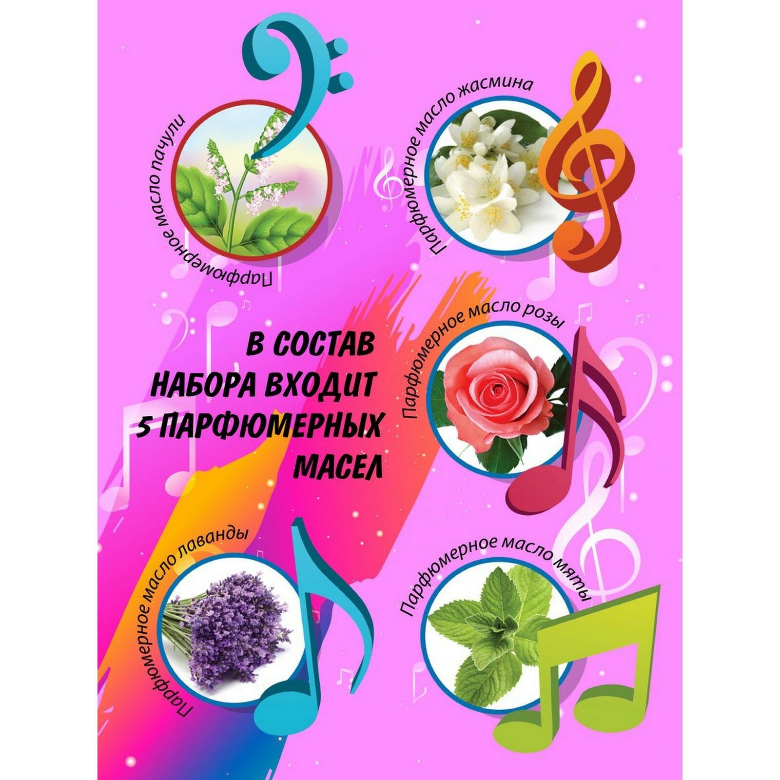 | Состав набора | парфюмерные масла пачули, жасмина, розы, мяты, лаванды; флакон-спрей; основа для духов; пипетки; пробирки; блоттеры; инструкция |