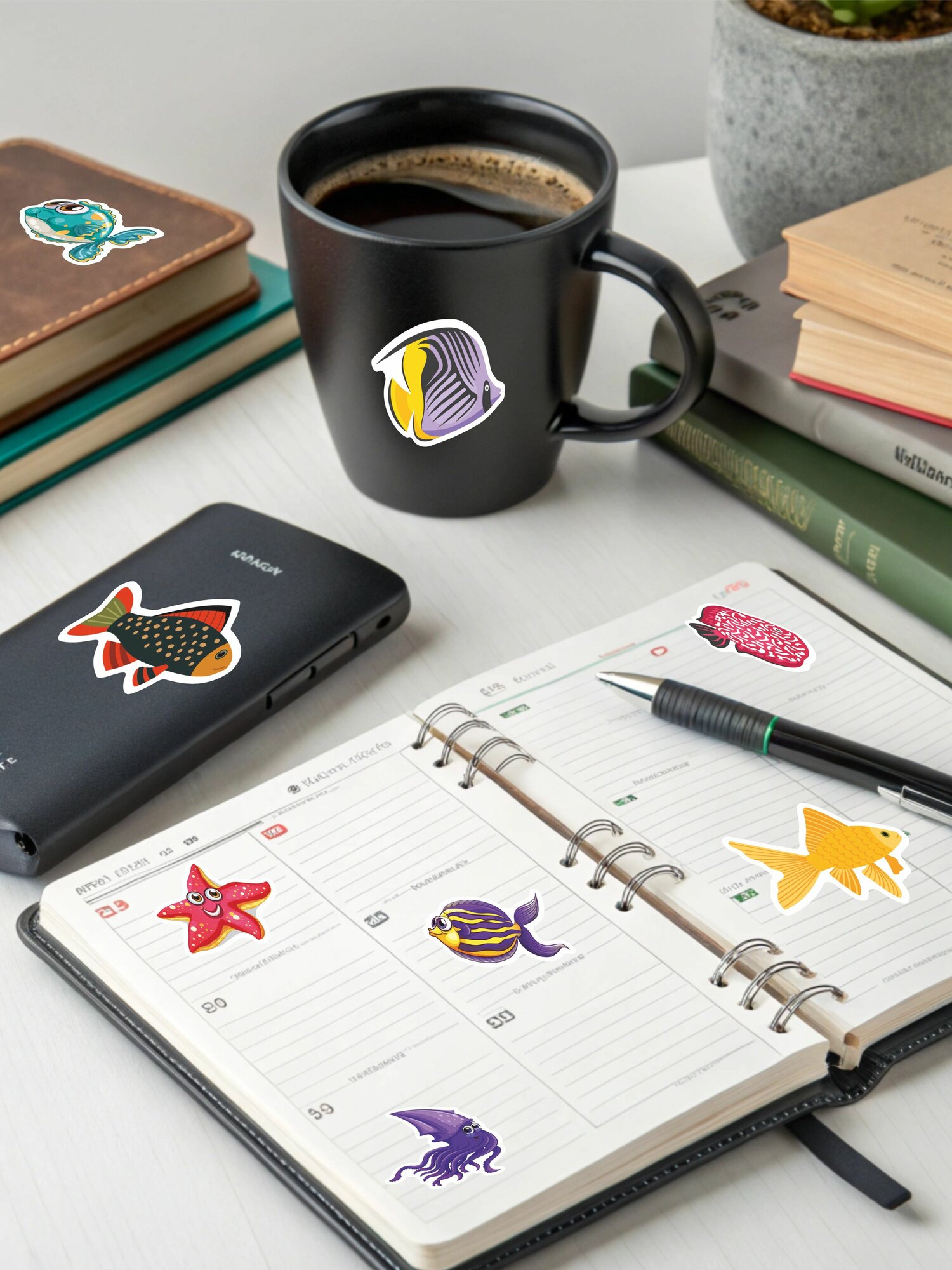Купить Наклейки стикеры милые "Рыбки", 97 шт, 18 листов А6. Для детей. Набор наклеек для декора, стикеры на телефон, чехол, ноутбук, BulbaCraft