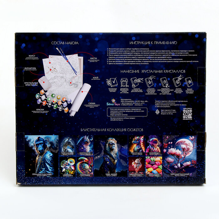| Особенности | кисти в комплекте / краски в комплекте / с кристаллами / с поталью / черный холст |