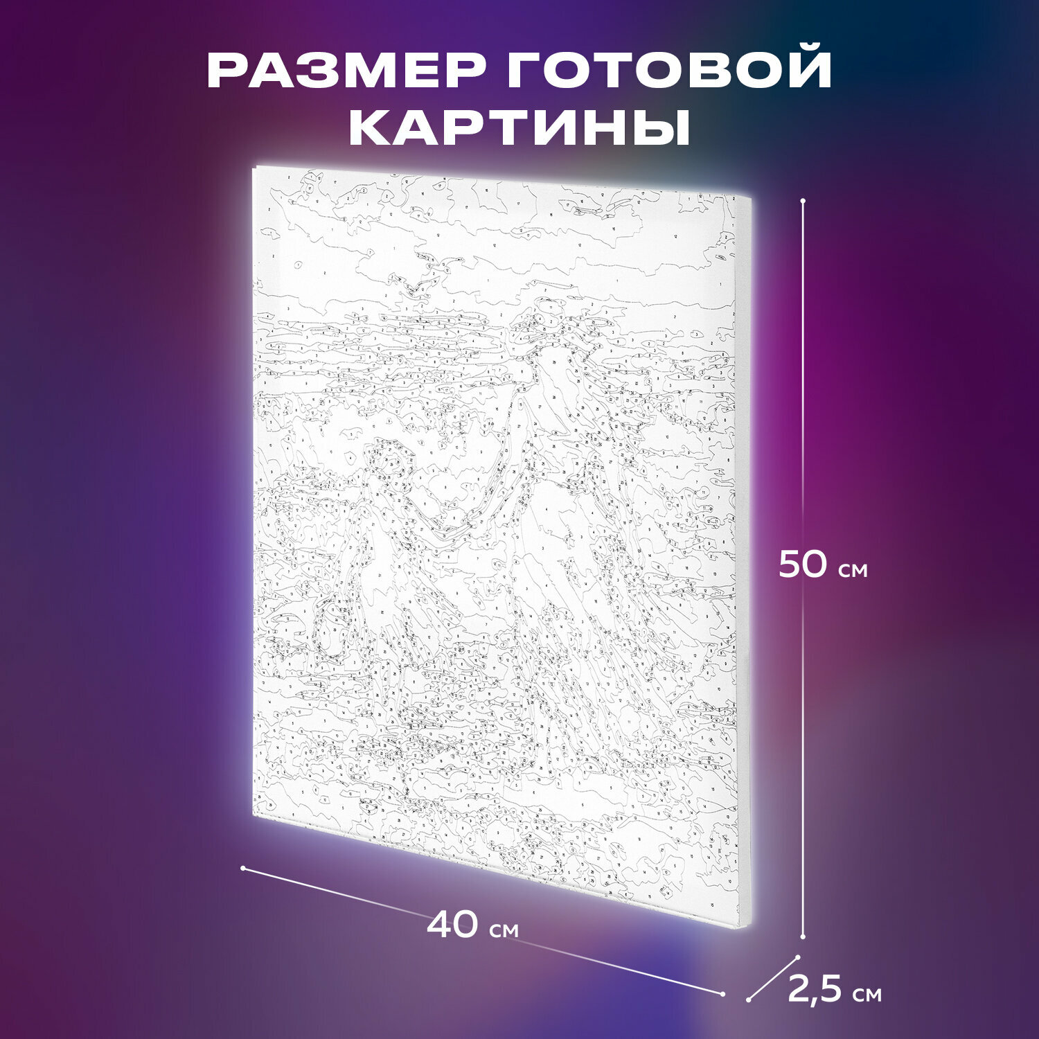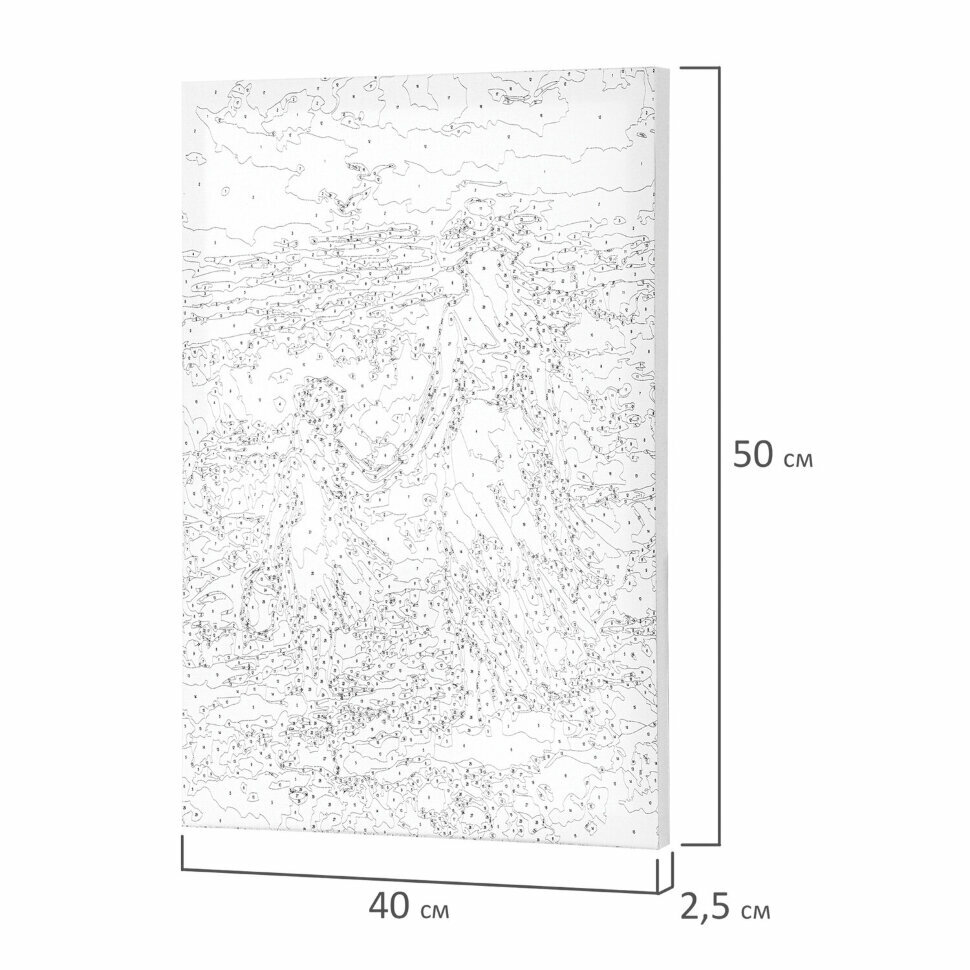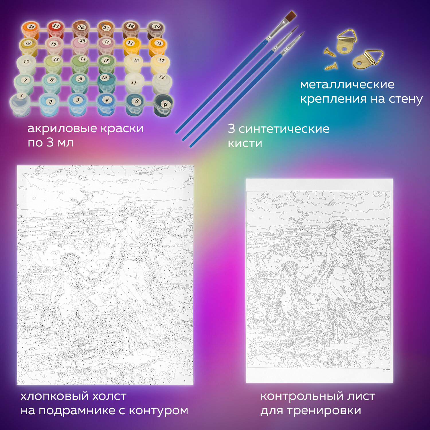 | Комплектация | 1 хлопковый холст на подрамнике с контуром, 1 лист бумаги для тренировки, 26 акриловых красок объемом 3 мл каждая, 3 синтетические кисти и комплект металлических креплений для подвешивания на стену |