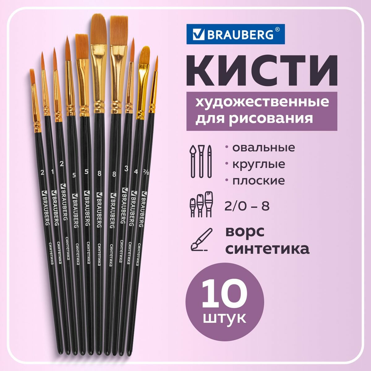 Набор кистей, синтетика, Brauberg 10шт, фиолетовые (Круглые; Овальные; Плоские; Лайнеры) (201029), 12шт.